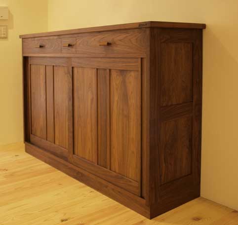 | 幅150cm×奥行41.5cm×高さ100cm 材料:ウォールナット 塗装:アトリエベル クラフトオイル、蜜蝋ワックス 天板はガラス張りになっていて、お子様のかわいい靴を収納されるそうです。 |